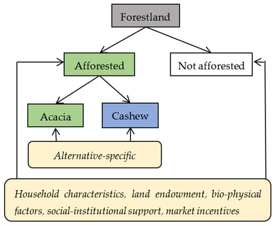 Farmers in the present study are expected to use land in a way that maximizes the net benefit of tree planting on their allocated land. We analyzed the two-level nested structure of forest land use, in which farmers decide whether to plant trees in the first stage and select acacia and cashew tree species in the second stage (see Figure 2). As a result, the two-level decision process provides a nest of acacia and cashew plantations. Unlike agricultural cultivation, acacia and cashew species share some characteristics, such as medium- to long-term plantations and requiring less labor and material input than annual crops. As a result, the independence of irrelevant alternatives (IIA) of acacia and cashew plantations is violated.
