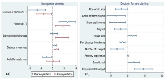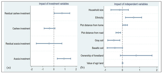 The impact of perceived LTS on investment is presented in Figure 3. Estimating Equation (10), the likelihood ratio (LR) tests for IIA in NLM and alternative-specific conditional logit (ASCL) models (for robust check) are statistically significant, indicating the presence of nested alternatives of acacia and cashew plantations (see Appendix A Table A3). This implies that these two alternatives are similar in their characteristics and do not hold the property of IIA. The fitness of NLM is statistically significant, nearly at the 5% level (p = 0.05), but the ASCL model is significant at the 1% level (p = 0.01). In both the NLM and ASCL models, the impact directions and significant levels of the included variables are almost similar, although the impact magnitudes are larger in the ASCL model. The residuals are strongly significant in both the acacia and cashew choices in the NLM, justifying the endogeneity of the perceived LTS variable and the appropriate selection of instrumental variables.