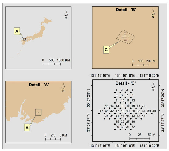 The study area was a baseball field roughly of size 0.02 sq km in the Yamaguchi University premises in Ube city, Yamaguchi prefecture, Japan as shown in (Figure 1). It was predominantly bare soil with very sparse weeds where maximum twig heights reached not more than 15 cm having an average diameter of about 1 mm. Observations were made at 47 specific points, as shown in the same figure. The soil type was dominantly hard reddish brown Lateritic type of soil.