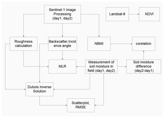 The Sentinel-1 images were later processed to extract the radar backscatter and incidence angles. Those were used in NBMI, MLR and the Dubois models. A correlation between NBMI and soil moisture change was investigated. The accuracy of the inverted Dubois solution was tested using field values for soil moisture in relation to the RMSE. The following subsections describe each step-in detail.