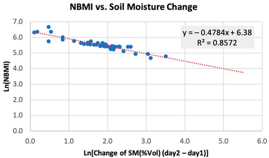 Figure 6. Scatterplot of change of soil moisture (Vol%) and NBMI on a logarithmic scale.