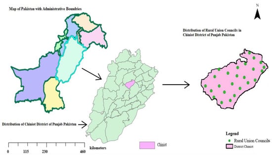 The study was carried out from 2018 to 2019 in the Chiniot district (31°43′12.00″ N; 72°58′44.00″ E) of central Punjab, Pakistan. The study area is present at an elevation of 179 m from sea level, with a total area of 1020 square miles. The climate of the study area experiences semi-arid conditions with an average annual temperature of 24.1 °C and average annual precipitation of 336 mm. According to the Agricultural Department of Pakistan, the major crops cultivated in the area are wheat (Triticum eastivum), rice (Oryza sativa), maize (Zea mays), and sugarcane (Saccharum officinarum); however, pearl millet, sorghum, sunflower, and pulses are also grown on a smaller scale. Both canal and tube well irrigation is used for agricultural purposes by the farmers in the selected district. The soil of the study area was a sandy, loamy, hyperthermic, typical calciargid type.