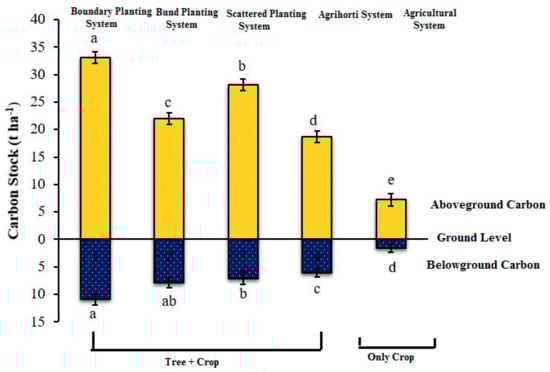Variations in plant biomass, carbon stock, and soil in the different agroforestry systems were compared by one-way analysis of variance using the Statistics 10 package. Means were compared for the significant difference by implementing the least significant difference (LSD) test at a 5% probability level. Graphs were plotted using Microsoft Office software (version 2016; Microsoft Corporation, Albuquerque, NM, USA).