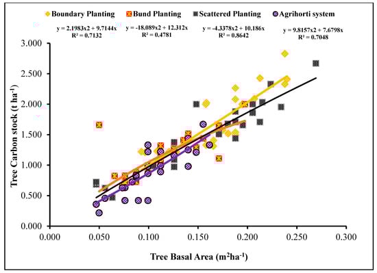 Relationship between tree biomass carbon stock (Mg ha−1) and tree basal area (m2 ha−1) for agroforestry inventory plots in the study area.