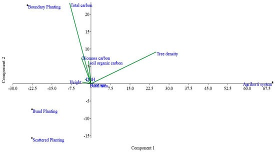 Ecosystem carbon stock, biomass carbon plus SOC (0–30 cm), as per IPPC guidelines, was measured to express the overall C sequestration potential of different agroforestry land use systems. Our estimates indicated that the ecosystem C stock was found in the order of boundary planting system > scattered planting system > bund planting system > agri-horti system > agricultural system. The total ecosystem C stock estimated in the boundary planting system was 85.09 t ha−1, increased by 27.52%, 29.70%, 52.57%, 127.14% more than the scattered, bund, agri-horti and agricultural land use system, respectively (Table 6). Statistical analysis with the help of “PCA” presented that the first two axes have 99.11% variation, and “PC 1” and “PC 2” explained 88.09 % and 11.01% of the variation in the tree age, tree density, basal area, tree height, diameter, biomass carbon stock, soil organic carbon and total carbon stock, respectively. Data loaded onto “PC 1” include boundary planting (r = −24.39), bund planting (r = −22.64), scattered planting (r = −22.68), and agri-horti system (r = 69.72); while on “PC 2” included boundary planting (r = 22.60), bund planting (r = −7.38), scattered planting (r = −15.64), and agri-horti system (r = 0.42). Across all agroforestry land use systems, total biomass carbon stock was positively associated with total soil organic carbon stock (Figure 4).