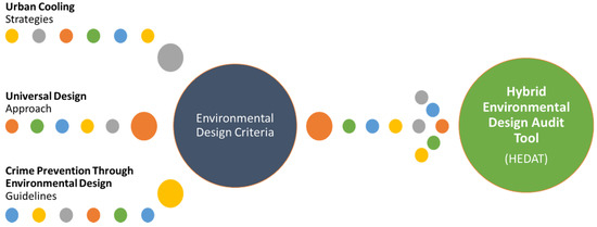 Process used to (1) identify relevant environmental design criteria and (2) develop the HEDAT using well-documented environmental design approaches: Urban Cooling Strategies [19]; UD [57]; and CPTED [58,59,60] (Image Source: Authors).