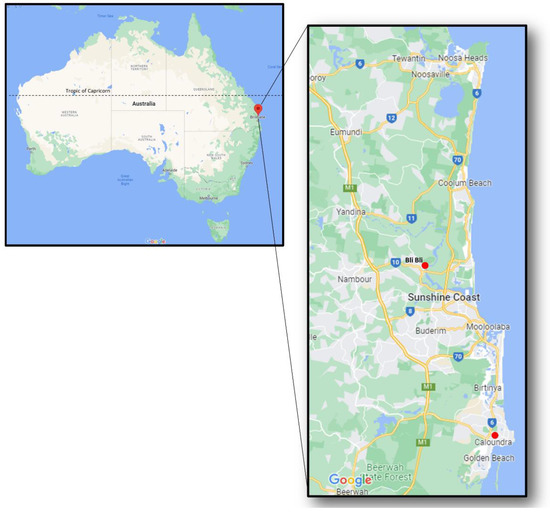 To evaluate localized environmental differences at the site level, we used two residential ACFs as case studies within Australia’s humid, subtropical Sunshine Coast Regional Council: approximately 22 km apart, in the suburbs of Bli Bli and Caloundra (Figure 2). Mean temperatures range from 15.9 °C to 25.5 °C annually, with an average precipitation of 1483 mm [73]. Australia’s Bureau of Meteorology predicts with high reliability that for Australia, temperatures will rise by +2.1 °C to +2.8 °C, and rainfall events will be more intense by 2040 with climate change [74].