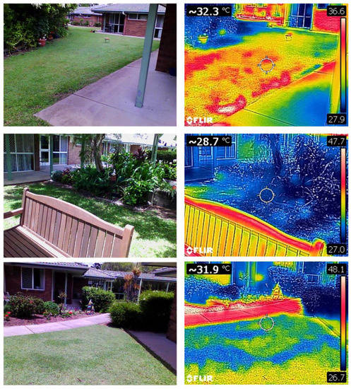 Five residential complexes are connected to Waroona by covered walkways. The horizontal and vertical surfaces at the Caloundra ACF are typically concrete pathways somewhat shaded with permanent roofed structures connecting independent residential units with the central facilities. Concrete pathways provide direct access between residential units and central facilities. Within the Memory Support Center, a narrow, short-loop concrete pathway facilitates residents’ circumnavigation within the courtyard. However, it is only partially shaded by tall open canopy trees and is too narrow for an attendant to walk beside a resident to pass each other, especially if using a mobility aid, and has limited sections with handrail supports. As with Bli Bli, all buildings comprise exposed cavity brick walls (medium to dark colors), and these are typically exposed to direct sunlight from most aspects. As expected, thermal camera images demonstrate higher temperatures for surfaces without shading (see Figure 6) and materials that retain heat: concrete pavements, non-irrigated areas of lawn, synthetic seat cushions, exposed brickwork, and exposed areas of gravel/stones used for garden mulch.