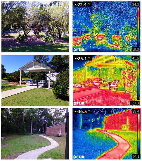 Four residential complexes are connected to the central administrative and activity center by covered walkways (Figure 3). The horizontal and vertical surfaces at the Bli Bli ACF are typically concrete pathways mostly shaded with permanent roofed structures connecting independent residential units. Concrete pathways also provide circuitous walkways around the southeast and eastern perimeter, though they need to be wider in places to support two people walking side-by-side. For the Memory Support Center, a concrete pathway partially covered by the building eaves and with limited sections with handrail supports facilitates residents’ circumnavigation of the building. All buildings comprise cavity brick walls (medium to dark colors) typically exposed to direct sunlight. Limited pathway connections exist between complexes and the street/neighborhood pathway network. Thermal camera images demonstrate higher temperatures for surfaces without shading than those shaded; exposed areas of lawns are likewise hotter surfaces than shaded pavements (see Figure 4).