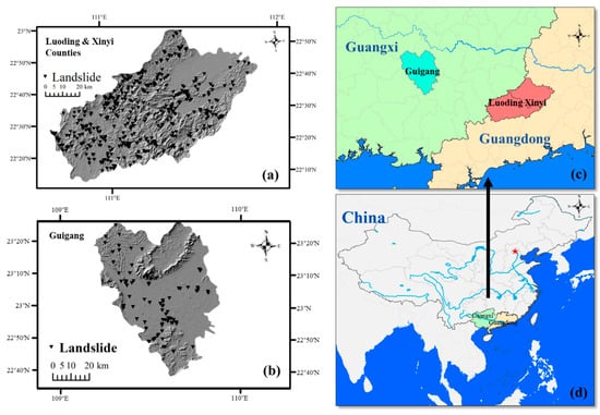 Landslide inventory maps of first two study areas in China. (a) the first one across Luoding County and Xinyi County (LX) of Guangdong Province, (b) the second one in Guigang County (GG) of Guangxi Province, (c) the locations of the study areas in Guangdong Province and Guangxi Province, (d) the locations of the two provinces in China.