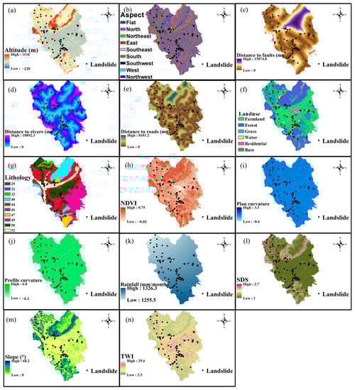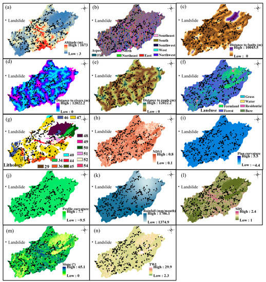 Thematic maps of the Zigui County: (a) altitude, (b) aspect, (c) distance to faults, (d) distance to rivers, (e) distance to roads, (f) land use, (g) lithology, (h) NDVI, (i) plan curvature, (j) profile curvature, (k) rainfall, (l) SDS, (m) slope, (n) TWI.