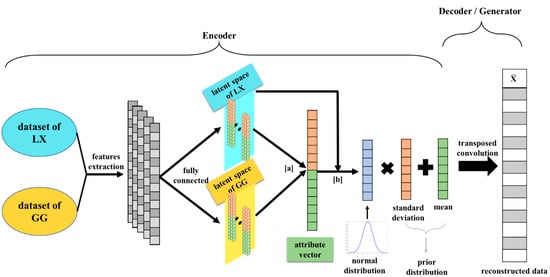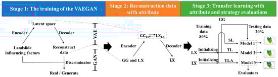Reconstructing data with attributes can make data with specified knowledge, thereby increasing the commonality and representativity of samples []. Specifically, a VAEGAN was pretrained by using the data set of LX and the one of GG. Additionally, the latent vector representations of each data set will be extracted by the pretrained VAEGAN. That is, for each attribute, the mean vectors of the latent space of landslide-influencing factors in each area are computed. Next, the attributes that existed only in a study area (e.g., GG) will be obtained by computing the difference between the mean vectors (operation [a] in Figure 6). Finally, the data containing the attributes of two areas will be obtained by reconstructing the vector, which is the integrated result of the attribute vector (with attributes) and the latent space of LX (without attributes) (operation [b] in Figure 6). The reconstructed data contain the attributes of the landslide-influencing factors in GG and LX, which makes the LSP model learn the attributes beyond one study area. Additionally, the TLA will then be achieved by fine-tuning the model pretrained by the reconstructing data with the labeled samples of GG (Figure 7).