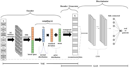 In Figure 5, the VAEGAN has two components: a VAE and a GAN, which share the same generator. Different from regular autoencoders, VAEs apply and learn the probability distribution on the latent space extracted by the encoder from the input, so that the distribution of outputs from the decoder matches that of the observed data. Next, the distribution sampled by the decoder will be encoded to reconstruct new data. Meanwhile, applying a discriminator in the VAE, which is to distinguish whether the data is real or generated, has a positive effect on model performance []. The loss of the VAEGAN is shown as follows: