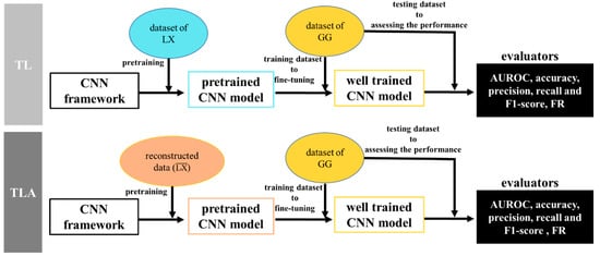 To evaluate the influence of the TLA on model performance, the experiments were implemented, and the results are listed in Table 4. The situation of the training and testing data set is on the left, and the mean value of evaluators (accuracy, AUROC, recall, precision, F1-score) is on the right. No transferring skills are applied in Experiment A; in Experiment B, the GG model is pretrained by the LX data set and fine-tuned with GG-labeled samples. In Experiment C, the GG model is pretrained by the data set with attributes (), that are reconstructed by VANs and then fine-tuned with GG-labeled samples.