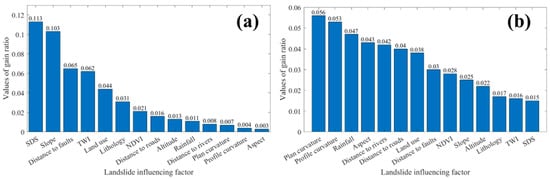 Importance of landslide-influencing factors, based on (a) LX and (b) GG.