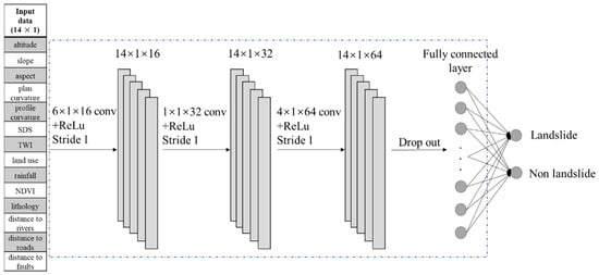 As a nonlinear tool that can extract key attributes from large numbers of data [], the CNNs are used as the LSP model and the feature extractor of a VAEGAN in this paper. In LSP, the CNN input is the landslide-influencing factors in vector format, and the output consists of the landslide (positive class) and nonlandslide (negative class) labels [,,]. In the TLA strategy, the feature extractor of the VAEGANs is a CNN without the classification layer. Furthermore, to avoid numerical problems, the all dimensions of the input data for the LSP model are normalized to [0, 1] by using Equation (1), before being included in the models.