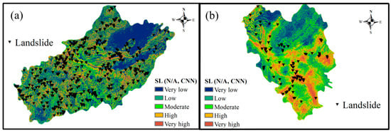Table 3 is the prediction results of the CNNs with best hyperparameters. The model performance is better when it is trained with the data set of LX. Especially in the AUROC, the model trained with the data set of LX performs better (about 6%) than the one trained with GG. This is because there are sufficient samples in LX. Figure 10 shows the LSMs of two study areas. Additionally, the natural break classification [] was used to classify landslide susceptibility indices (probability) as very low, low, moderate, high and very high.