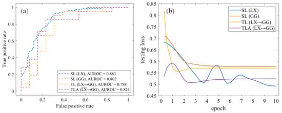 (a) AUROC curves and (b) training efficiency on validation set of SL, TL and TLA. The symbol “LX→GG” represents the fact that the LSP model is pretrained by the data set of LX and then fine-tuned by the data set of GG, and the represent the reconstructed data that contains the attributes of the data set in LX and the data set in target domain (e.g., GG).