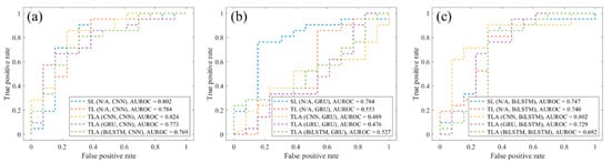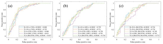AUROC curves on testing data set of (a) CNN, (b) GRU and (c) BiLSTM. The contents in the bracket, such as (CNN, GRU), represent that the decoder of VAEGAN is CNN and that of LSM models is GRU, respectively.