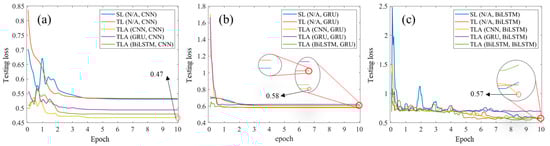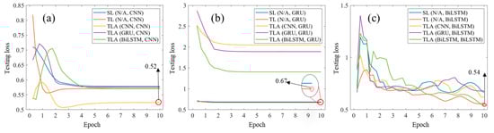 The loss during training is one of the evaluators reflecting the quality of the data set []. The training results are shown in Figure 13. For the LSP models, although GRU converges the fastest, the CNN model has the lowest converging loss. Additionally, BiLSTM is less stable than the others. For transferability (e.g., Figure 13a), the loss is much less in the early training stage when the TLA strategy is used, especially when a CNN is used as VAEGAN feature extractor. This indicates that the TLA technique is effective.