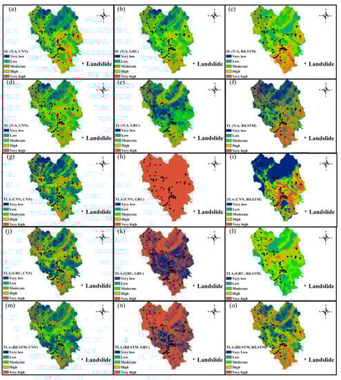 Figure 14 shows the LSMs in GG predicted by models. In Figure 14h,k,n, most grids in the study area are classified as in a very high susceptibility zone, which is inappropriate. It is indicated that the GRU is underfitting when the training samples are inadequate. The model performance seems to be improved by the TLA strategy. In fact, most samples of the testing data set are predicted as the “landslide”, increasing the F1-score and the mean value of evaluators. However, the AUROC and accuracy are poor. This conclusion also can be proved from another aspect. For the data set of the target domain (GG), when reconstructing the data by using a GRU-VAEGAN, the reconstructed data contain little attribute similarity and can even be seen as the noise and can decrease the effect of TLA strategy because of data-set bias. This indicates that the GRU is not a suitable feature extractor of a VAEGAN. In Figure 13a, in case TLA (GRU, CNN), at the beginning, the loss is higher than the losses of the other cases, indicating that the attribute similarity between the data set used to pretrain the model and the one of target domain is minor. The loss converges to a lower value because of the strong fitting ability of the CNN.
