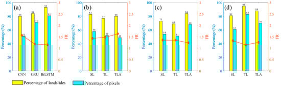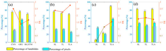 The LSMs of well-trained models should have higher landslide-density values (frequency ratios) in very high susceptibility zones than in other ones []. To qualitatively evaluate the model performance values, the FR method was used; the FR values in the high and very high susceptibility zones of each situation are shown in Figure 15. For the LSP models, the high and very high landslide susceptibility zones predicted by the CNN contained 75% of the historical landslides but only accounted for about 30% of the total area, reaching the highest FR value by comparing them with GRU and BiLSTM. For transferability, Figure 15b–d shows the FRs when the LSP model is the CNN, GRU and BiLSTM, respectively. Additionally, it can be concluded that compared with the SL and the TL, the TLA strategy can significantly improve the performance of an LSP model.