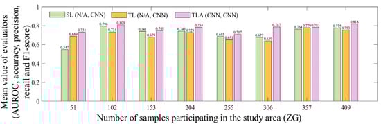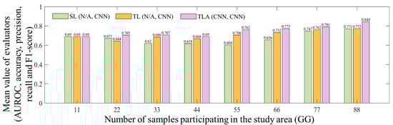 Table 6 and Figure 12 show the mean values of the above evaluators and ROC curves. When the TLA techniques (in Experiments C, D and E) were used, the performance values of the models are improved, especially the CNN. The best ROC curve of the TLA reaches the highest, 0.844, by comparing those with the SL (0.771) and the TL (0.772).