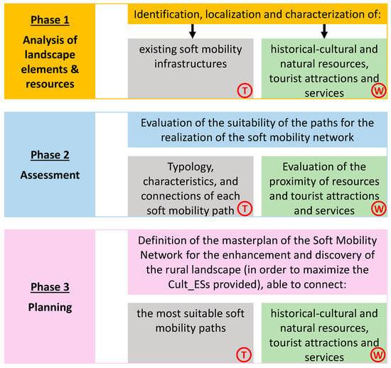 - Phase 1: Analysis of the landscape elements and resources that provides for the identification, localization, and characterization of the elements with (Ⓦ) which to enhance humans interactions (historical-cultural and natural resources, tourist attractions and services) and the existing paths through (Ⓣ) which people are supported to access the rural landscape that could potentially be used to build the soft mobility network.