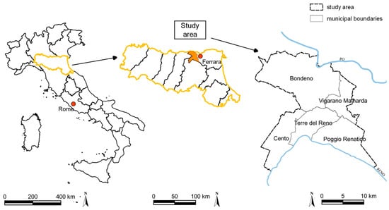 The study area (Figure 3) is the “Union of Municipalities” of Alto Ferrarese in the Province of Ferrara, which includes five municipalities (Bondeno, Cento, Vigarano Mainarda, Terre del Reno and Poggio Renatico), in an area of about 413 km2 with 76,000 inhabitants, located West of the city of Ferrara and South of the Po River.
