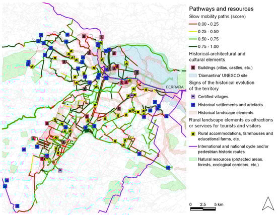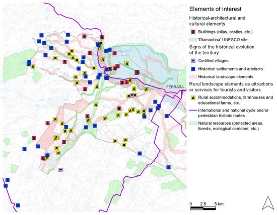 Given the focus of the study, only the elements of interest in the rural areas have been considered, while the urban centers have been considered only as a possible origin for the trip. The elements of interest mapped are: (1) historical-architectural and cultural elements (such as UNESCO sites, villas, historical palaces, castles, fortresses, churches, monuments and museums); (2) signs of the historical evolution of the territory related to the landscape and human activities (such as signs of the reclamation of the lower Ferrara plain, or the ‘Dossi’ and ‘Partecipanze’ system); (3) natural resources (such as protected areas, forests, ecological corridors, etc.); (4) elements of the rural landscape that can represent an attraction or a service for tourists and visitors (such as rural accommodation and facilities, farmhouses, farms with direct sales, educational farms, certified historic villages); (5) international and national cycle and/or pedestrian historic routes that can bring tourists to the study area or that can be reached by the residents.