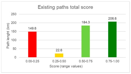 The same procedure has been applied to consider the presence of areas of historical, cultural, and tourist-recreational importance and the proximity of international and national cycle and/or pedestrian historic routes. After all correction factors (minus and plus) have been assigned, a total score for each stretch of the existing paths has been calculated.