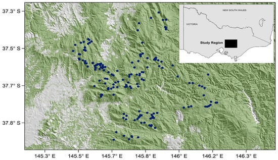 Figure 2. The location of the montane ash forests in the Central Highlands of Victoria, showing long-term field sites in the region where arboreal marsupials, birds, and vegetation structure and composition have been monitored since mid-1983 [38] (see Table 1 for further description of relevant datasets).