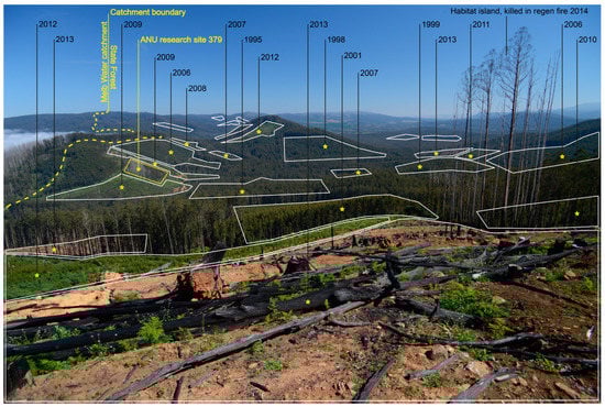 The primary form of human disturbance in montane ash forests is high-intensity clear-cutting operations conducted on a 40–80 year rotation [39] (Figure 3). Cutblocks are typically 15–40 ha in size, with up to three contiguous adjacent logged areas able to be cut, summing to a maximum of 120 ha of harvested area [40]. Approximately 50% of the montane ash forest in the Central Highlands of Victoria has been clear-cut in the past 50 years [33]. In the event of wildfire, burnt stands of montane ash forest are typically subject to post-fire (“salvage”) logging [28]. Importantly, the forests in the Central Highlands of Victoria are owned largely by the Government of Victoria, with the majority of the forest estate (~80%) available for logging. Following logging, cutblocks are then subject to assisted regeneration practices (primarily through aerial seeding of overstory trees) [32].