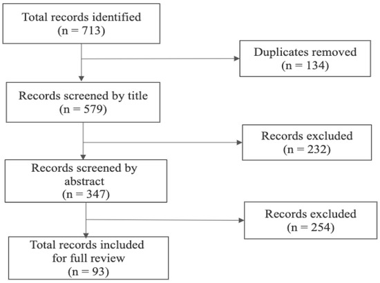 The evaluation stage of this research included a screening process, an eligibility stage, and an inclusion stage to select the final studies used in this research. As indicated in Figure 1, the initial search of various scientific databases and websites resulted in a total of 713 research documents. Following this, duplicate documents were removed, which brought the number down to 579. After this, the titles were screened, and this resulted in the elimination of documents that were unrelated to the current study. This brought the number of research documents down to 347. The next step involved an abstract screening of the remaining documents. Studies that were not relevant to this research were excluded, yielding 93 selected documents eligible for full-text review. In this context, “relevant” means that the study focused on land-use planning and in particular addressed the issue of stakeholder participation or that it focused on the digital twin and addressed the theoretical point of the technology, its conceptualisation, its architecture, its characteristics, and its potential in land-use planning. The inductive content analysis method was used in analysing the data from the reviewed documents [45]. This included the categorisation, grouping, and abstraction of the main ideas, leading to new narratives of the connection between land-use planning and digital twins in broader themes. The data were analysed to identify where in the land-use-planning process stakeholder participation and stakeholder influence are currently critical. It was also analysed to identify those features of the digital twin technology needed to improve stakeholder influence on land-use interventions. Using logic and conceptual reasoning and the researcher’s knowledge of the subject matter, we narrowed this down to specifically establish the relationship between stakeholder participation in land-use planning and the potential of the digital twin technology. The results of the findings were interpreted to confer meaning and clarity to the data. This was accomplished by discussing, comparing, and contrasting the data to find similarities in and differences between the findings and the broader literature on land-use planning [42,44]. Some data were also presented by using tables, figures, and relational models. Figure 1 summarises the literature search process.