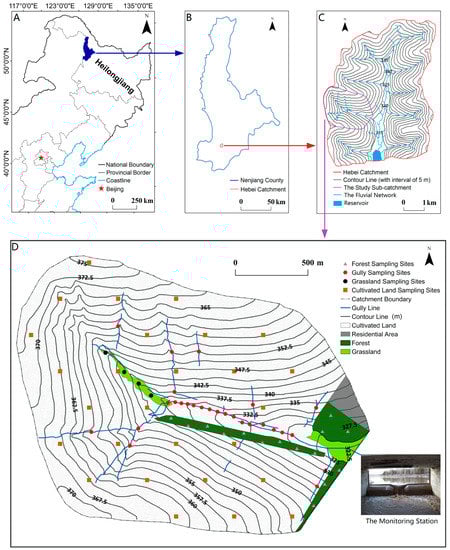 Figure 1. The location of Nenjiang County in Northeast China (A), the location of Hebei catchment in Nenjiang County (B), the location of study sub-catchment in Hebei catchment and the fluvial network (C), and the topography and landuse and the distribution of sampling points of the study sub-catchment (D).