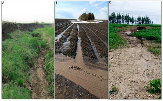 Three main types of soil erosion occur in the study area: wind erosion, snowmelt erosion and erosion driven by rainfall. Wind erosion occurs during the dry winter and spring seasons, but rates of soil loss associated with wind erosion are low. Annual soil loss due to wind erosion of 0.58 t ha−1 year−1 has been reported by Jiang [41]. The sediment output from the study catchment is dominated by erosion associated with rainfall and snowmelt. Significant rainfall does not occur during the spring-thaw period [37]. Erosional events associated with snowmelt and rainfall are therefore temporally distinct. Linear gullies are a key feature of the catchment, as shown in Figure 1, and these gullies function during erosion events associated with both snowmelt and rainfall. These features are commonly in the order of 300–400 m in length, 1–2 m wide and approximately 1 m deep and they are actively developing. They are frequently extended by ephemeral gullies developed during major erosional events. Sheet and rill erosions are widespread across the catchment during erosional events. On the uniform slopes, the most serious rill erosion occurs on the lower slopes, although it can affect 85% of the slope length. Where midslope gradients are variable, rill erosion is concentrated in the low-lying areas, typically occurring over ~65% of the entire slope. Figure 2A presents an image of a typical gully in the study catchment. Examples of typical sheet and rill erosion during snowmelt and during a major rainfall event are shown in Figure 2B,C, respectively.