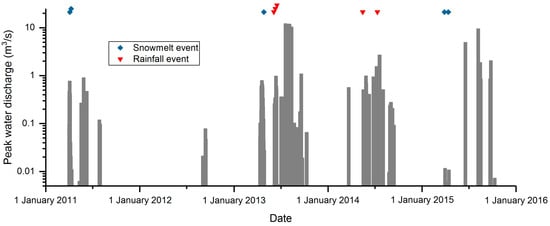 Figure 3. Maximum discharges associated with the 123 rainfall and snowmelt events sampled at the outlet of the study catchment during the period 2011–2015. The events sampled are identified, and further details of these events are provided in Table 2.