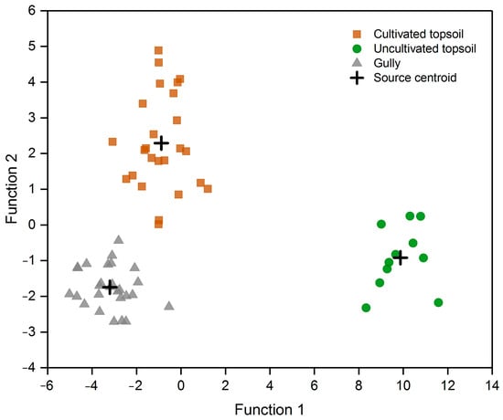 Figure 4. Scatter plot of the discriminant functions representing the samples collected from the three potential sediment sources.