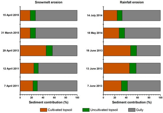 Generally, for the five snowmelt events, gully erosion contributed more sediment yield (65.6%) than cultivated topsoil (25.5). For the five rainfall events, the gully and cultivated topsoil contributions changed to 54.4% and 35.4%, respectively. Taking the 10 events together, the results indicate mean contributions of sediment from cultivated topsoil, uncultivated topsoil and gullies of ~30%, ~10% and ~60%, respectively. The mean contribution values for three sources indicate that while the contributions from uncultivated topsoil remain similar for snowmelt and rainfall events, gully contributions either dominate or are very similar to the contributions from cultivated topsoil for both sets of events, but the contributions from cultivated topsoil are generally higher for rainfall events than for snowmelt events.