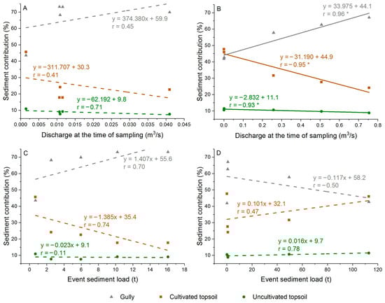 Figure 7. Relationships between source contributions and water discharge at the time of sampling and event sediment yield for snowmelt events (A,C) and rainfall events (B,D). Statistically significant fitted regression lines are shown as solid lines. An asterisk (*) is used to denote r values associated with relationships that are significant at a >95% level of confidence.