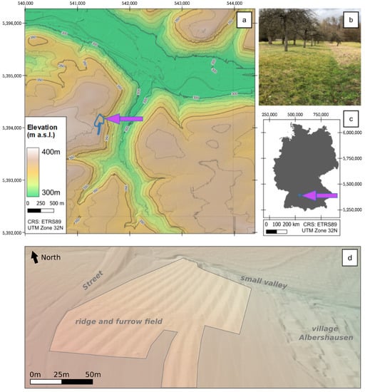 (a) Topographical map of the area surrounding the plot “Höfelbett” in Albershausen based on LiDAR DEM data (©www.lgl-bw.de (accessed on 24 January 2023)) [36]. The blue line frames the plot Höfelbett. (b) Picture of the plot with visible ridge- and furrow structures. (c) Location of the study area within Germany. (d) 3D view of the study area (elevation and hillshade) based on LiDAR DEM data (©www.lgl-bw.de (accessed on 24 January 2023)).