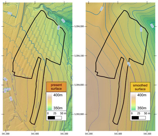 Comparison of the present (left) and smoothed (right) surface topography based on the LiDAR DEM (©www.lgl-bw.de (accessed on 24 January 2023)) [36]. The black line frames the classified cultural site within the plot Höfelbett.