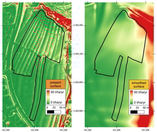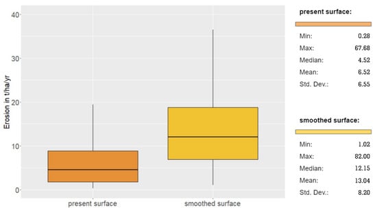 Compared to RUSLE calculations by ESDAC [53], both our smoothed surface and our present surface scenario models predict soil erosion rates above the European average for arable land of t/ha/yr (see Figure 5). This difference of maximum values cannot be attributed to a single factor of our model. Generally, it seems that the combination of the USLE factors in our study leads to such high erosion rates compared to the European scale RUSLE calculations, which are more sensitive for surface runoff distribution [37,54,55].
