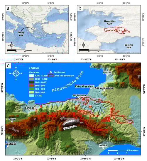 Figure 1. Map of the study area showing (a) its general location in the Eastern Mediterranean, (b) its position between the Alkyonides and the Saronic Gulf in Greece, and the boundary of the May 2021 fire (red-colored line), and (c) the main settlements and elevation in relation to the extent of the 2021 fire.