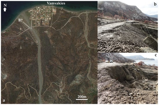 Figure 6, shows characteristic images from the debris flows occurrences identified after the storm of 26 November 2021 at the outlet of basins B7, B12 and B13 near Vamvakies and Mavrolimni port (Figure 6a,b), between Schinos and Vamvakies villages at the outlets of basins B5 and B6 (Figure 6c,d,h) and at the outlets of basins B8, B14, and B15 (Figure 6e–g, respectively).