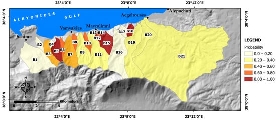 Subsequently, five classes of equal interval were defined for the probability P obtained for cartographic illustration purposes, a practice followed also in previous works [70], namely: (1) 0–0.2: slightly probable, (2) 0.2–0.4: moderately probable, (3) 0.4–0.6: probable, (4) 0.6–0.8: very probable, (5) 0.8–1.0: highly probable. The following map (Figure 5) shows the probability in the study basins.