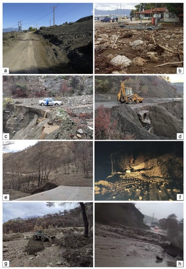16. Lancaster, J.T.; Swanson, B.J.; Lukashov, S.G.; Oakley, N.S.; Lee, J.B.; Spangler, E.R.; Hernandez, J.L.; Olson, B.P.E.; DeFrisco, M.J.; Lindsay, D.N.; et al. Observations and Analyses of the 9 January 2018 Debris-Flow Disaster, Santa Barbara County, California. Environ. Eng. Geosci. 2021, 27, 3–27. [Google Scholar] [CrossRef]
