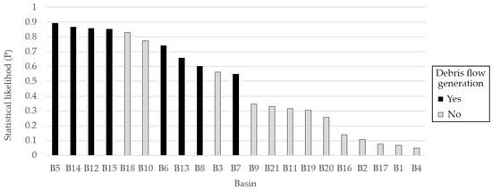 To explore the statistical significance of this association, we examined the variable of probability against the actual catchment binary response (i.e., debris flow generation or no debris flow generation) through a Mann–Whitney U test. The test showed a statistically association between the two variables (sig. = 0.001), indicating a statistically significant difference between the value of probability in the basins, where we recorded a debris flow generation, and the basins that we did not.