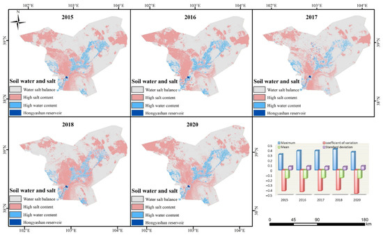 3.1.1. Comprehensive Indices of Soil Moisture and Soil Salinization