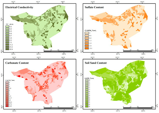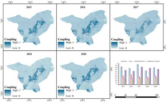- In the lower part of the Shiyang River Basin, arid climatic conditions, high sediment content, and high sulfate content were found to greatly influence the degree of soil–vegetation coupling coordination. These factors have significant impacts on ecological and environmental governance in the study area.